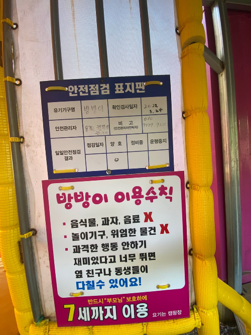 또한 방방이도 초등학생용과 어린이용으로 나뉘어서 2개로 운영되는데, 안전점검 표지판까지 작성되어 있는 걸 보니 아이들 안전에 있어서 철저히 관리하시는 편인 것 같다.