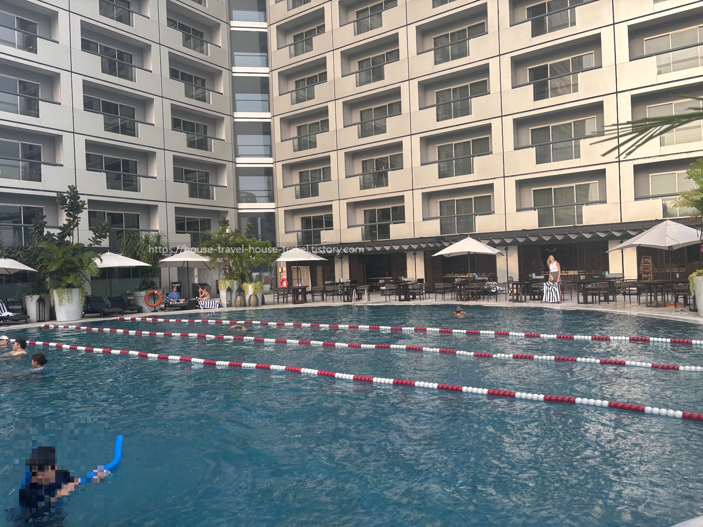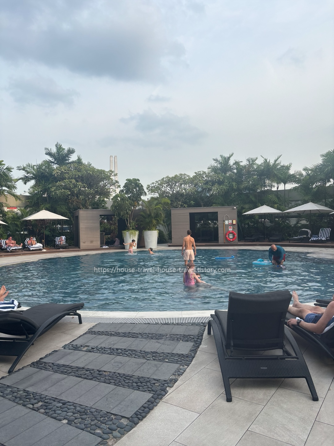 이 중에서 저희가 이용한 시설은 수영장이에요. 스위소텔 더 스탬포드 수영장은 바로 옆에 위치한 자매 호텔인 Fairmont Singapore와 함께 사용하는데요, 크기가 썩 크지는 않지만 그래도 아이들 놀기에는 아주 좋았어요.