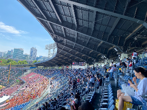 너무 뜨거워서 앉아 있을 수가 없어서 통로에서 맥주 마시면서 경기 시작을 기다리고 있었다.
